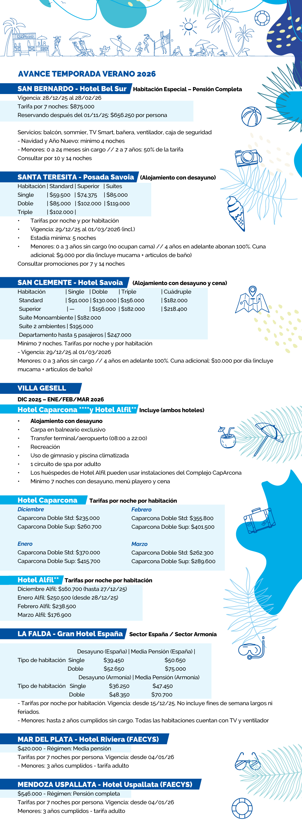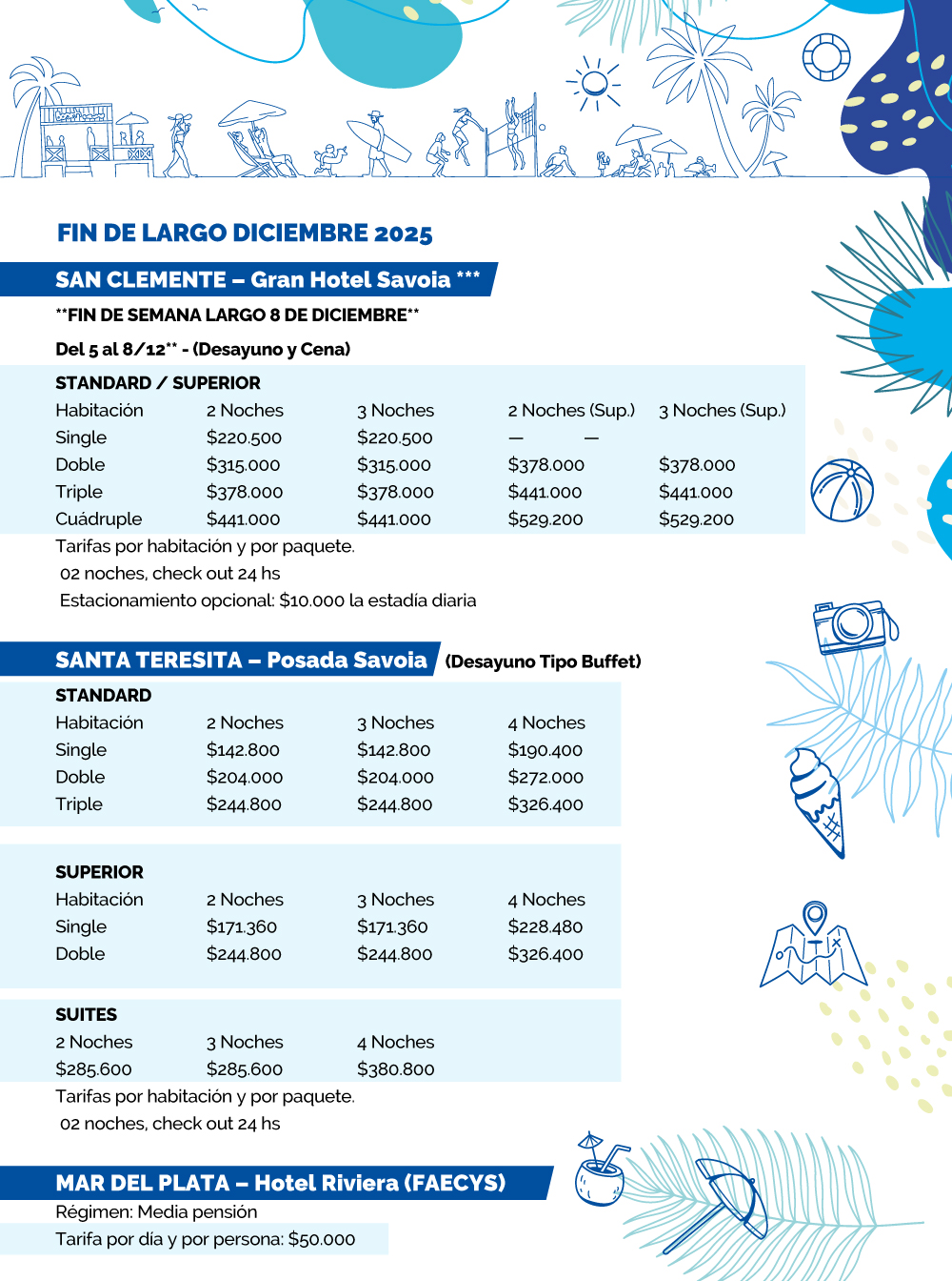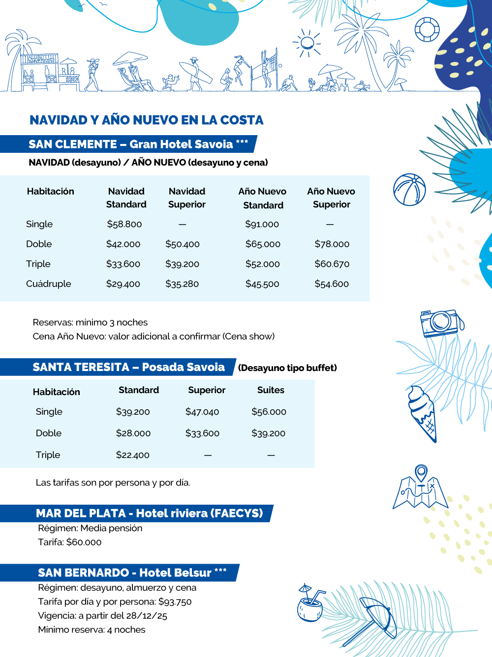 Comunicate con nuestra Secretaría de Turismo para consultar sobre información adicional, conocer los servicios y disponibilidad: turismo@sec.org.ar tel: 4359-5012.Importante: Para realizar reservas deberás tener tu cuota sindical al día. Las Tarifas son por persona, sujetas a modificación sin previo aviso. No incluye transporte. Consultar tarifas de menores y opciones con transporte